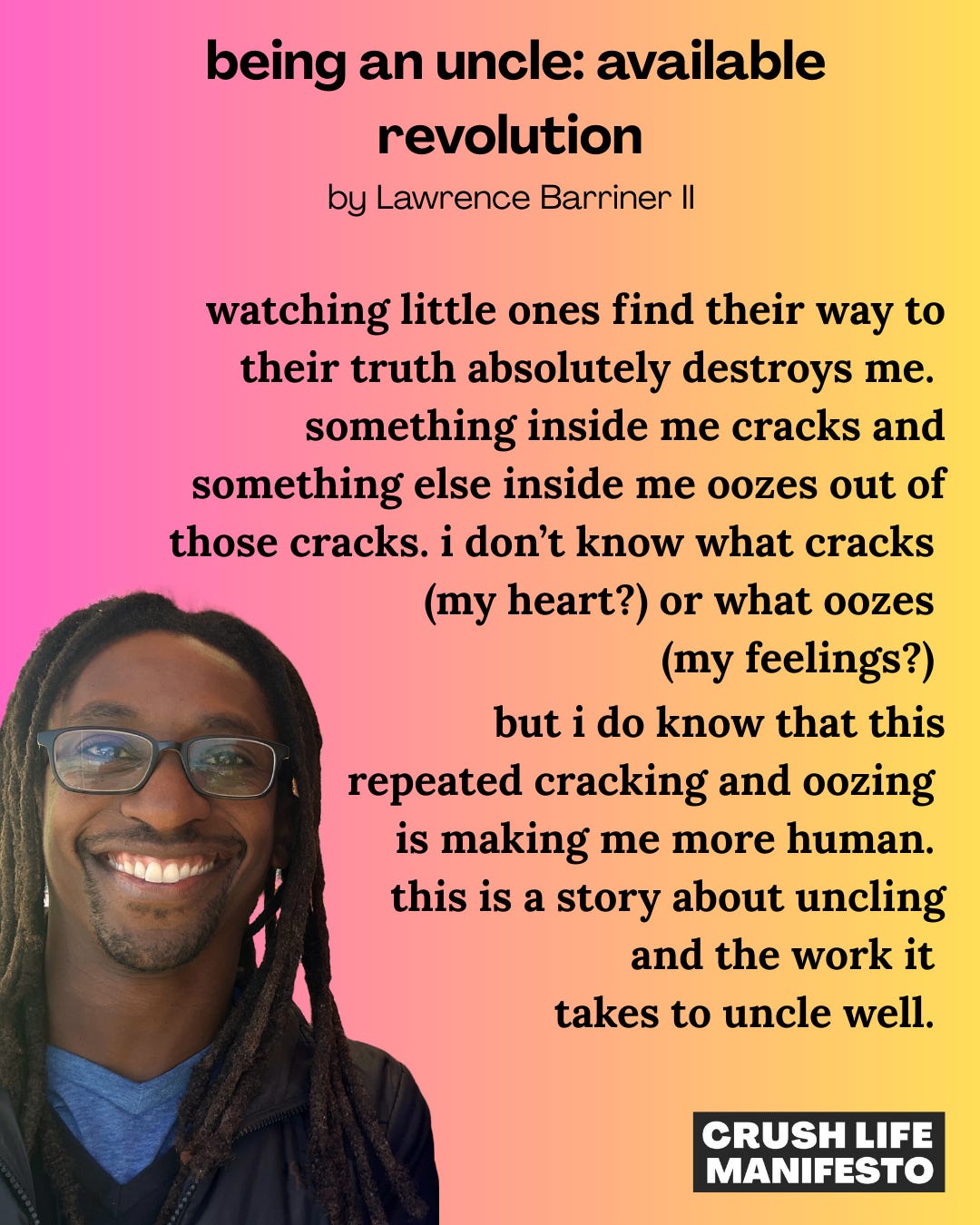 i genuinely believe that if we change how men in our society relate to children, almost everything about our world will change. there are many pathways to that change and i’m positively obsessed (thank you, octavia butler, for that concept) with uncling as one of them. will you join me4?