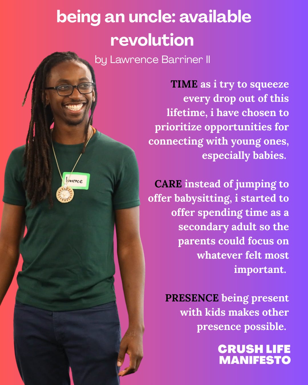and over the years that i’ve spent time with young kids, my practice has begun to inform some theory that i’m expanding and deepening in a few places (including this essay). in this crush life context, i wanted to share about three specific things that are fundamental to my uncling: